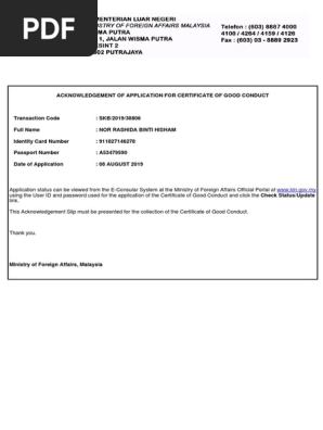 Certificate Of Good Conduct Malaysia Acknowledgement Slip