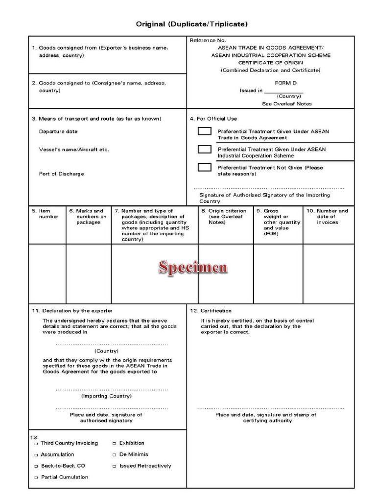Certificate Of Origin Form D Association Of Southeast Asian Nations Exports