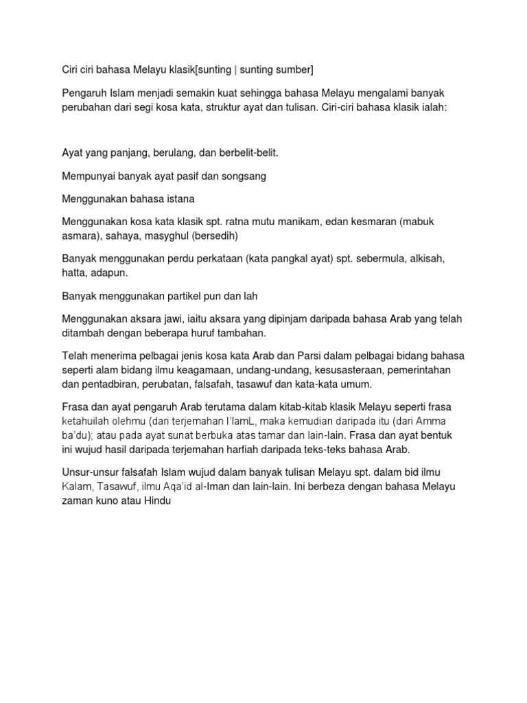 Ciri Ciri Bahasa Melayu Klasik