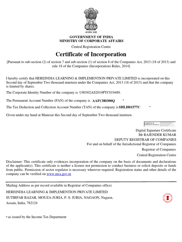 Certificate Of Incorporation Companies Corporations