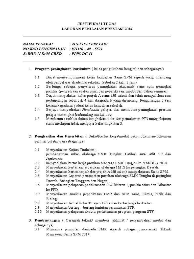 Contoh Justifikasi Penilaian Prestasi