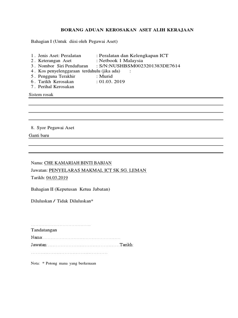 Borang Aduan Kerosakan Aset Alih Kerajaan Peralatan Ict
