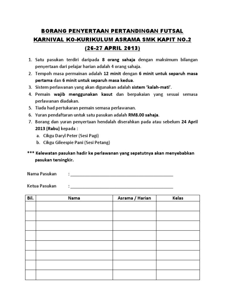 Borang Penyertaan Pertandingan Futsal Portal Web Viewborang Penyertaan Pertandingan Futsal Doc Document