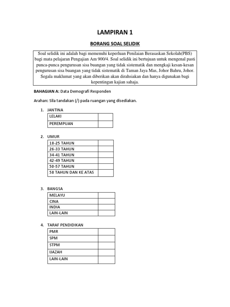 Mohon kerjasama anda supaya menjawab soal selidik ini dengan jujur. Makluman kepada responden. 60 lampiran borang pemerhatian kerja kursus pengajian am kod mata pelajaran 900 4 nama penyelidik.