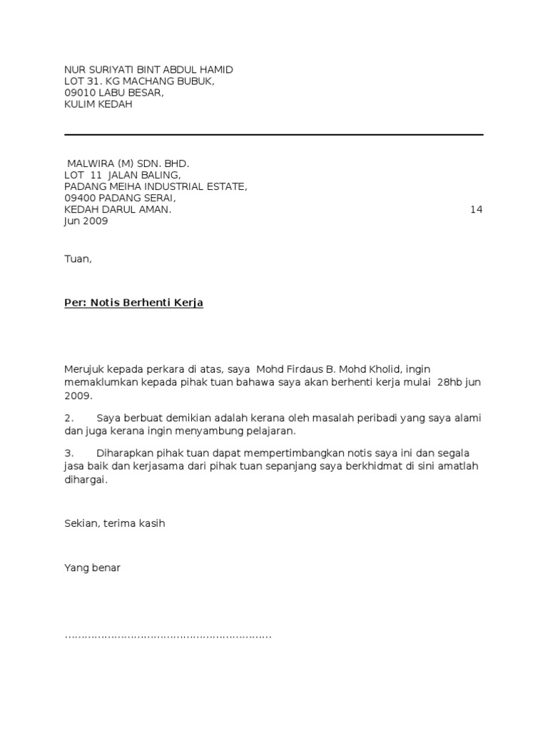 Contoh Surat Berhenti Kerja Surat Perletakan Jawatan
