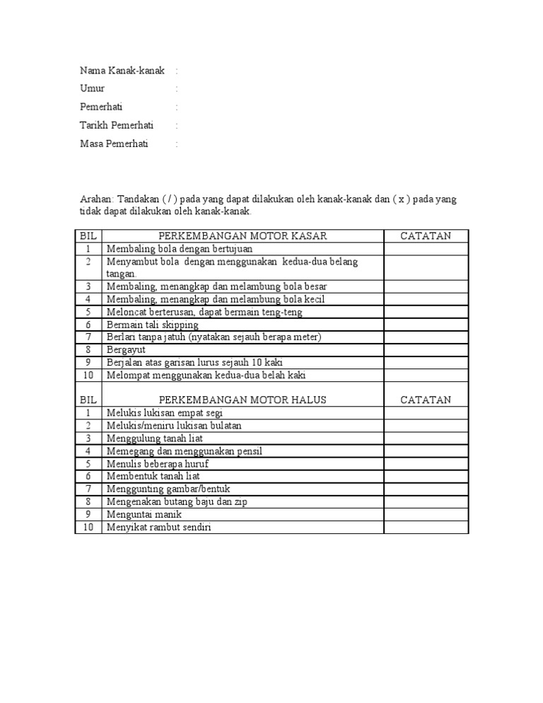 Contoh Senarai Semak Perkembangan Fizikal Kanak Kanak