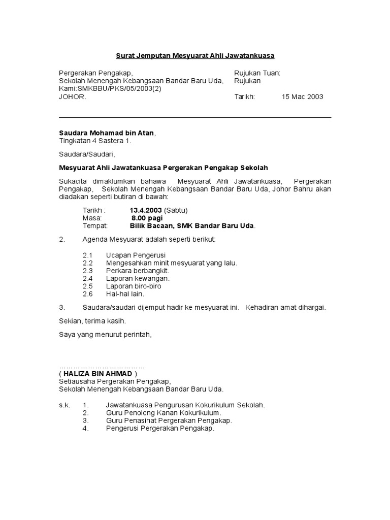 Contoh Surat Mesyuarat Ahli Jawatankuasa Download Doc