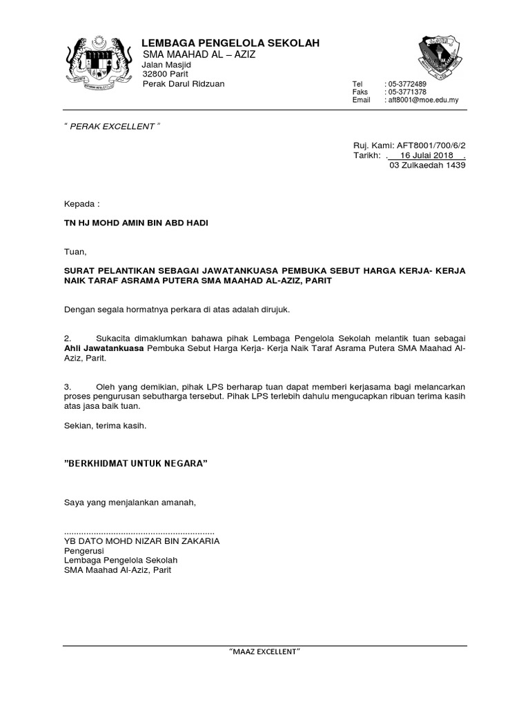 Contoh surat lantikan jawatankuasa sebutharga. Salinan sijil akuan pendaftaran dari kementerian kewangan bekalan perkhidmatan 2. Penilaian sebut harga bekalan dan perkhidmatan penilaian sebut harga bekalan perkhidmatan hendaklah dibuat oleh dua 2 jawatankuasa yang berasingan seperti berikut a jawatankuasa penilaian teknikal i keahlian hendaklah tidak kurang daripada tiga 3 orang iaitu seorang pengerusi dan dua 2 orang ahli. Contoh surat lantikan ketua panitia 8.
