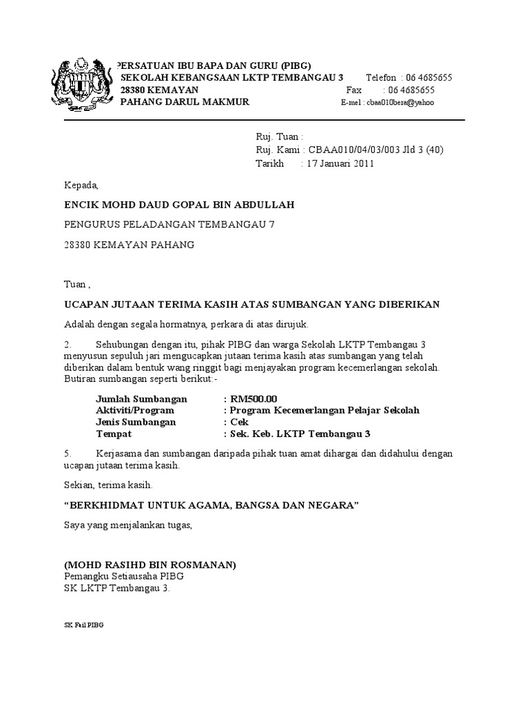 Surat Rasmi Terima Kasih Atas Sumbangan Bagikan Contoh