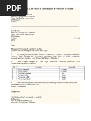 Surat Memohon Kebenaran Meminjam Peralatan Sekolah