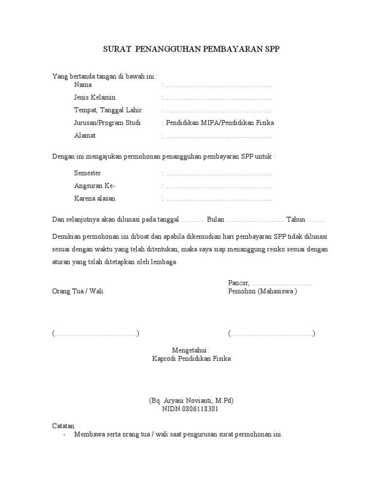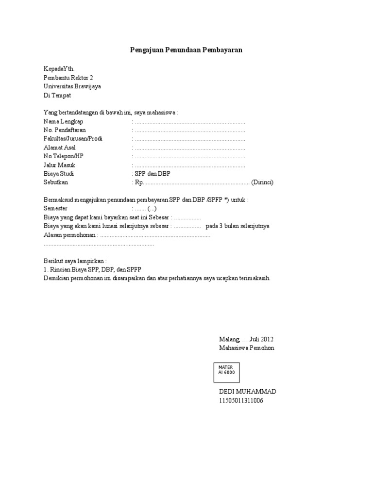 Surat permohonan penangguhan pembayaran spp sosialisasi sk rektor no864un26ku2017 perihal uang. Demikian surat permohonan ini saya buat dengan sebenar benarnya. Dengan ini saya mengajukan permohonan untuk melakukan pembayaran spp variabel semester genap ta 2013 2014 dikarenakan keterlambatan pembayaran yang sudah jatuh tempo pada tanggal 14 maret 2014.