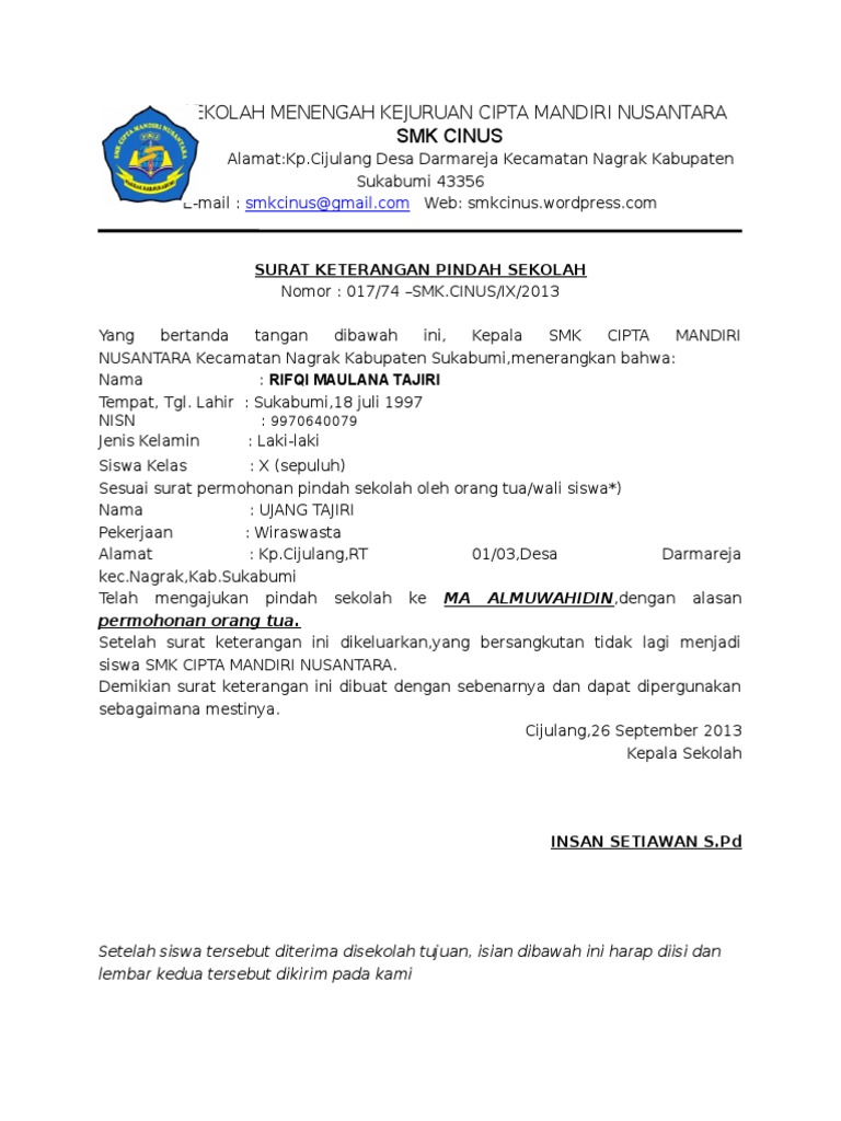 Surat Permohonan Pindah Sekolah Oleh Orang Tua Persoalan P