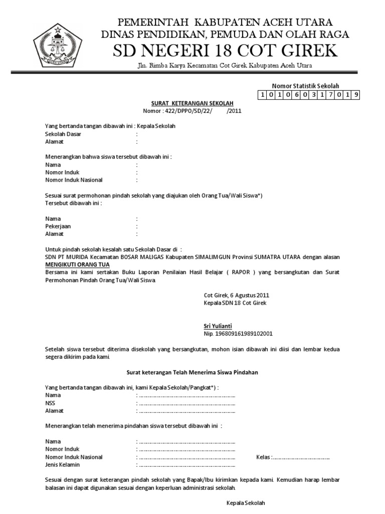 Surat Keterangan Pindah Sekolah Pdf