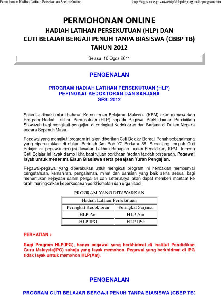 Hadiah Latihan Persekutuan Hlp Dan Cuti Belajar Bergaji Penuh Tanpa Biasiswa Cbbptb 2016