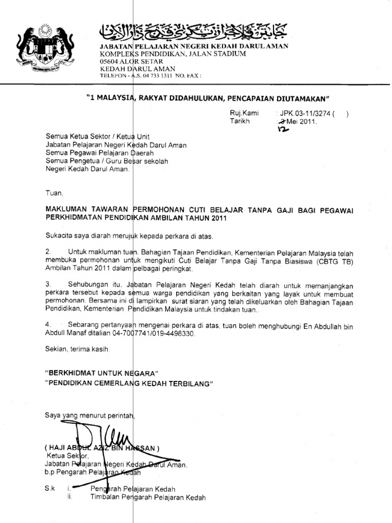 Surat Makluman Tawaran Cuti Belajar Tanpa Gaji Pdf Document