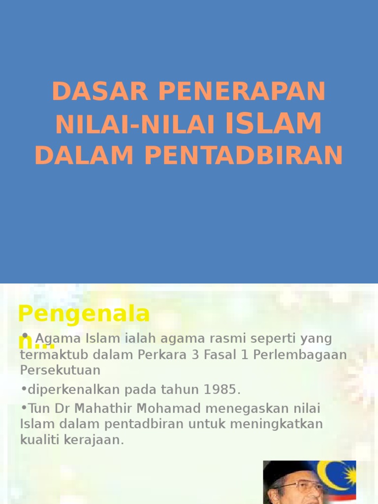 2 tahun 2001 mengenai garis panduan mengadakan ceramah penerapan nilai nilai islam dalam perkhidmatan awam telah diperkenalkan dengan memberikan penekanan kepada penerapan nilai nilai teras bagi dihayati oleh setiap. Sebagaimana yang telah dinyatakan oleh jabatan agama islam selangor 2010 iaitu sekularisme merupakan konsep yang memisahkan manusia dengan agama. Suatu kesinambungan dasar penerapan nilai nilai islam selepas era tun dr.