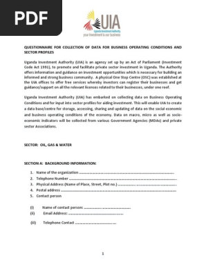 Questionnaire For Collection Of Data For Business Operating Conditions And Sector Profiles Percentage Taxes