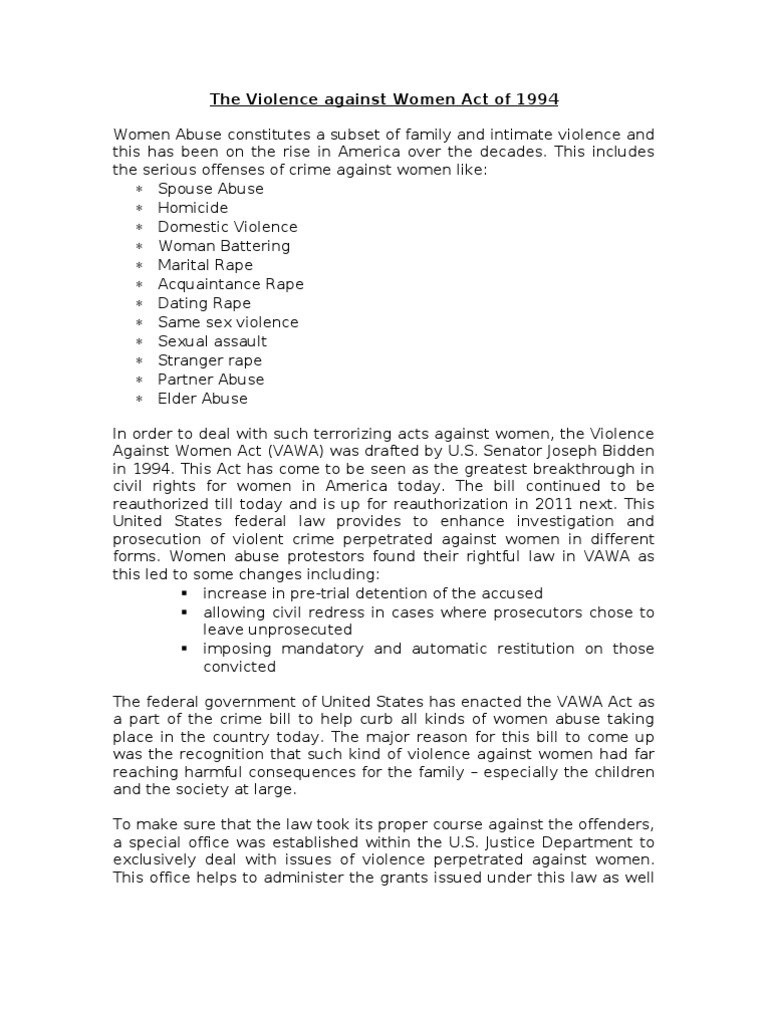The Violence Against Women Act Of 1994 Violence Domestic Violence