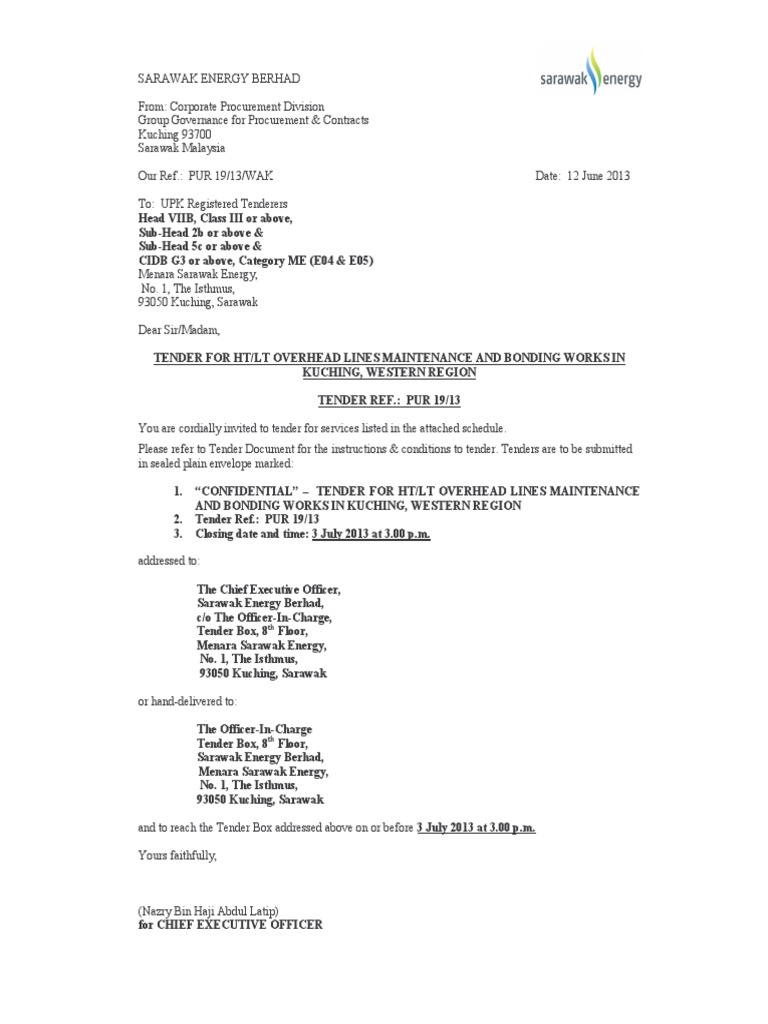 Sarawak Energy Berhad Sesco Etender Notices Tender Must Be Submitted On The Accompanying Form Of Tender Together With All The Sesco Bhd Central Store Sarawak Energy Berhad