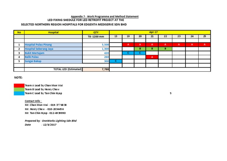 Led Fixing Shedule For Led Retrofit Project At The Selected Northern Region Hospitals For Edgenta Mediserve Sdn Bhd